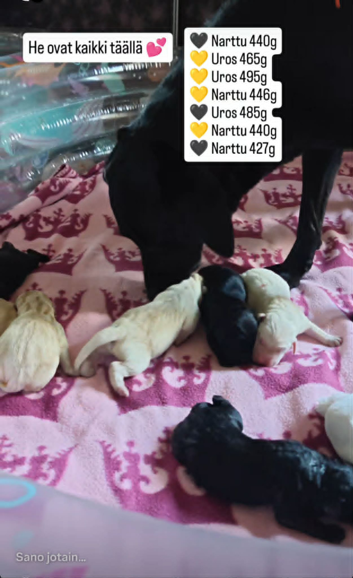 Kaikki on sujunut todella hyvin mutta aluksi maidon nousun kanssa oli hieman haasteita. Lauantaina illasta maito kuitenkin lähti hyvin nousuun ja siitä eteenpäin pennuille on maitoa riittänyt reippaasti ja painot nousevat hyvää tahtia.